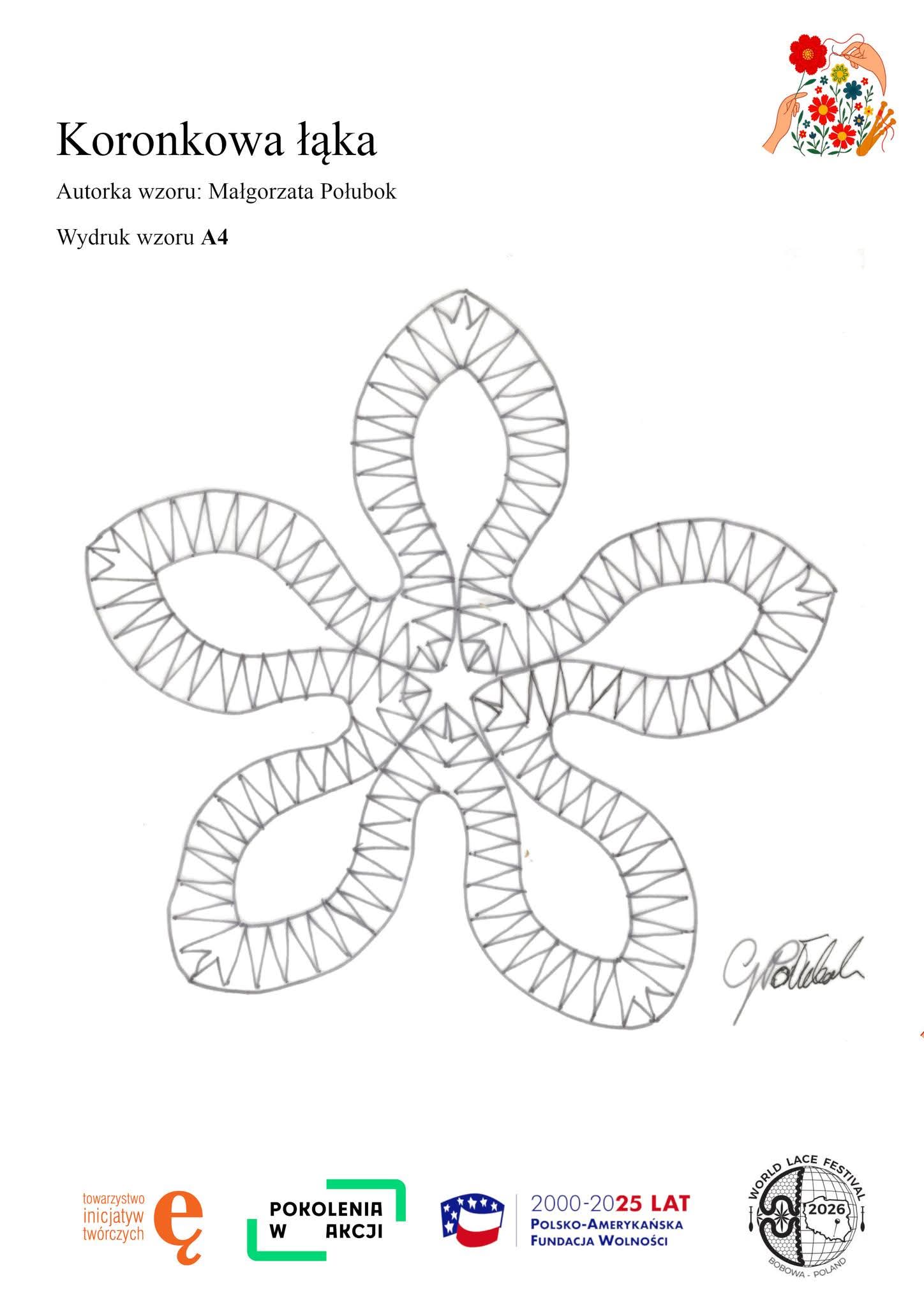 Wir laden Sie ein, Spitzenblumen in Klöppeltechnik herzustellen, die Teil einer Installation voller Zartheit und handwerklichen Herzens werden. Sie müssen nicht perfekt sein – wichtig ist, dass sie Ihre sind. Denn die schönsten Gärten entstehen, wenn wir sie gemeinsam schaffen. Unten finden Sie freie Muster zur Herstellung der Spitzenblumen. In Bobowa wird während des Weltspitzenfestivals eine Spitzenwiese erblühen.