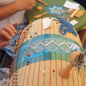Wir treffen uns, um gemeinsam im Stiftshof zu klöppeln.