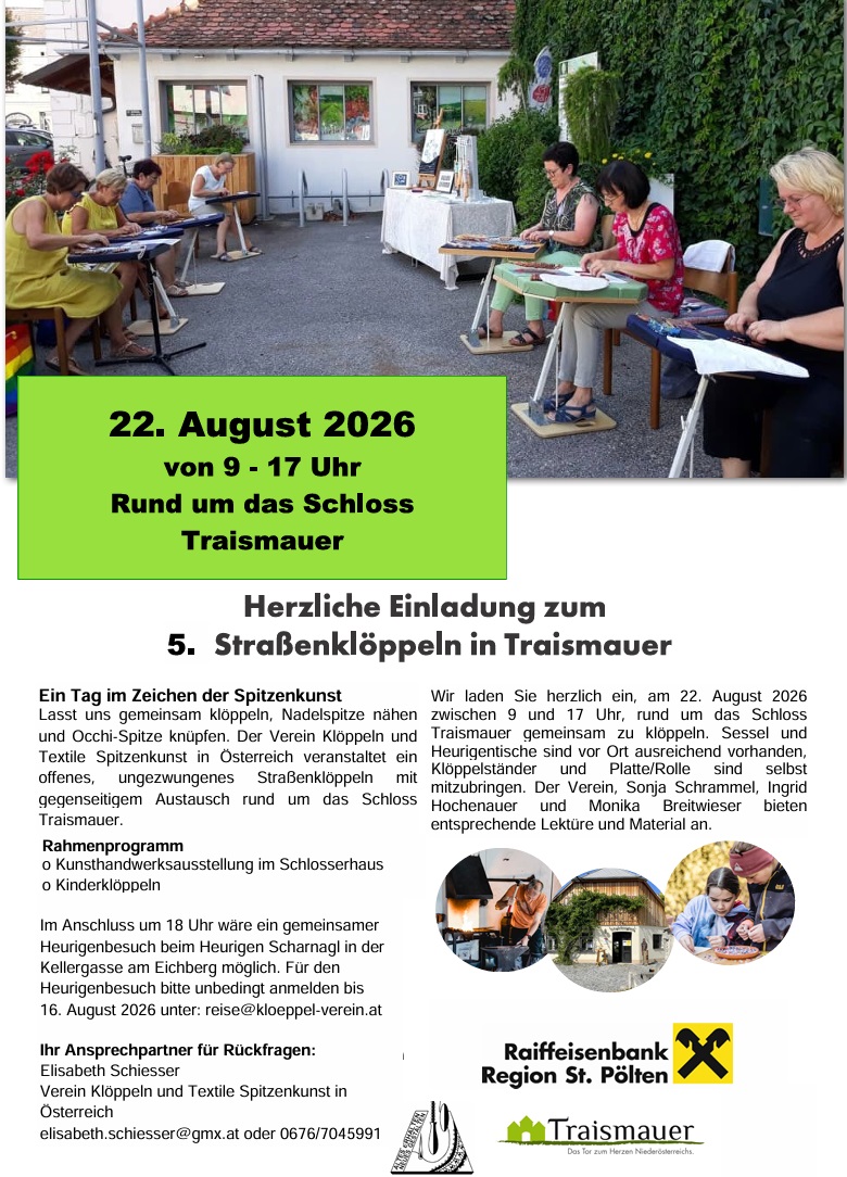 Schloss Traismauer Hauptplatz 1, Traismauer, NiederösterreichVeranstaltungen5. Straßenklöppeln in Traismauer Ein Tag im Zeichen der Spitzenkunst Lasst uns gemeinsam klöppeln, Nadelspitze nähen und Occhi-Spitze arbeiten. Der Verein Klöppeln und Textile Spitzenkunst in Österreich veranstaltet ein offenes, ungezwungenes Straßenklöppeln mit gegenseitigem Austausch rund um das Schloss Traismauer. Wir laden Sie herzlich ein, am Samstag den 22. August 2026 zwischen 9 und 18 Uhr, rund um das Schloss Traismauer gemeinsam zu klöppeln. Sessel und Heurigentische sind vor Ort ausreichend vorhanden, Klöppelständer und Platte/Rolle sind selbst mitzubringen. Der Verein, Sonja Schrammel, Ingrid Hochenauer und Monika Breitwieser bieten entsprechende Lektüre und Material an. Rahmenprogramm o Kunsthandwerksausstellung im Schlosserhaus o Kinderklöppeln