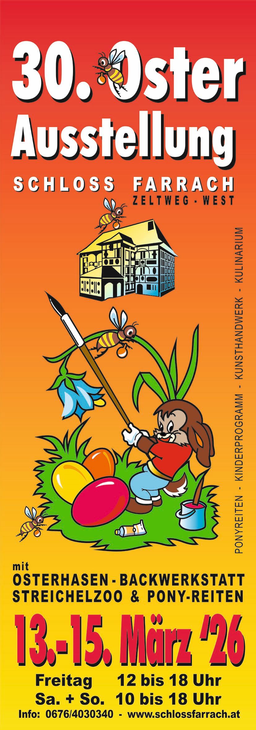 Vom 13.-15. März regiert der Osterhase im Schloß Farrach (Zeltweg-West). Hier kommen auch Kunsthandwerksliebhaber:innen auf ihre Rechnung … kunstvolle Ostereier, Klöppelspitze, Schmackhaftes für die Osterjause, Osterhasen aus verschiedenen Materialien und Frühlingshaftes Flair machen die 30. Osterausstellung zum lohnenden Ziel für den ersten Familienausflug im obersteirischen Frühling 2026! Für die Kleinen gibt’s viel Action: Ponyreiten, Alpakas, ein Streichelzoo mit echten Oster-Hasen, Bastelstationen und die Osterhasen-Backwerkstatt! (Info unter 0676-4030340, www.schlossfarrach.at)