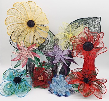 Großformatige XXL-Blüten bis Mini-Blüten – bald verschönern Sie damit Ihr Heim oder Ihren Garten. Einfache Gründe kombiniert mit einer markanten Umrandung setzen die Objekte in Szene. Die Umrandung sorgt für genügend Stabilität. Geklöppelt wird mit einem speziellen Garn für draußen. Durch eine Zusatzbehandlung sind die Blüten „ganzjahres-freiland-tauglich“.